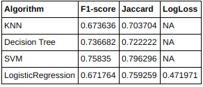 | algo_result = pd.DataFrame(columns=['Algorithm', 'F1-score', 'Jaccard', 'LogLoss']) | |
